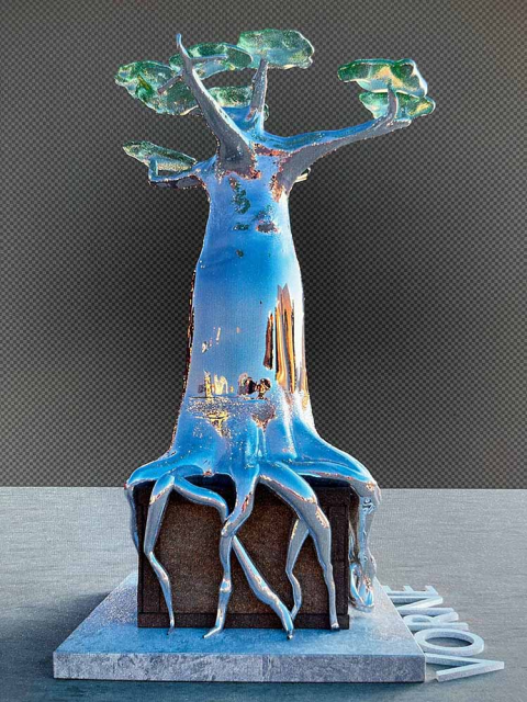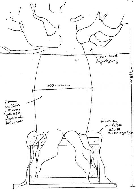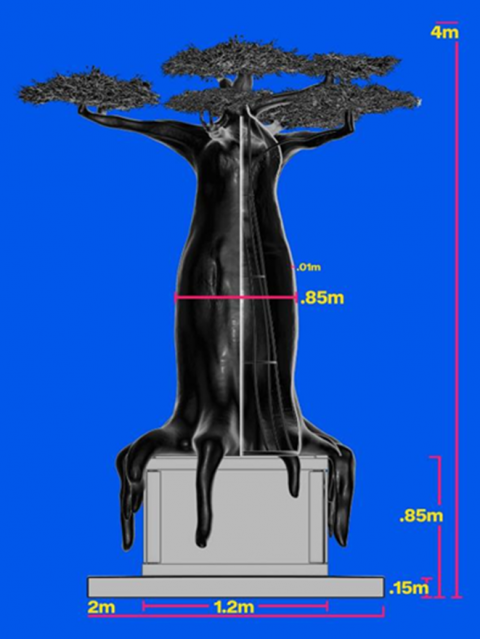 Die Trans­port­kis­te wird in Holz­op­tik aus Beton gegos­sen. Der Bao­bab wird von einer Fach­fir­ma aus spie­gelnd beschich­te­ten Poly­car­bo­nat gefer­tigt und soll an der dicks­ten Stel­le des Stam­mes einen Durch­mes­ser von ca. 85 cm haben. Die Gesamt­hö­he beträgt knapp 4 Meter.